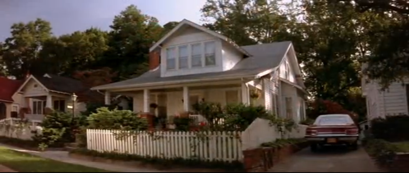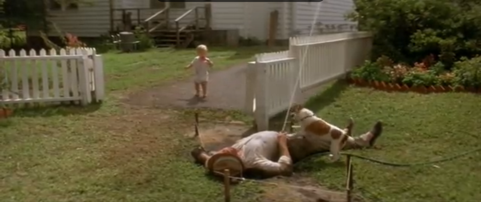 The camera tilts down onto a white picket fence with roses in front of it. The sky is mainly clear and sunny, the pathetic fallacy suggesting that this is a happy day. The fence is bright white and the roses are vividly red, in contrast to the fence, and perfectly formed. The whole shot is perfect. However looked into this a little closer then the roses could be to represent a mask of something more sinister underneath, like the thorns that are below the petals.