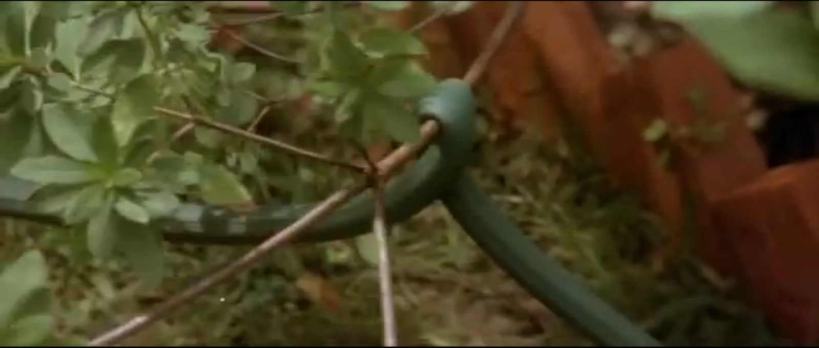 Again the camera returns to the male character as he tugs on the hose. This could be interpreted as him attempting to fight back the inevitable or against nature, as he later suffers a fatal stroke, but this is not made clear until later on in the film. The next straight cut is made to a match on action shot of the hose wound round a twig. This struggling of the man to free the hose and the pressure of the water increasing continues, all using straight cut transitions. This sequence is created to build frustration and tensions inside the minds of the audience. The diegetic, but increased, sound of the hose continues and raises in volume. This again adds to the suspense and tension that is built up within the sequence.