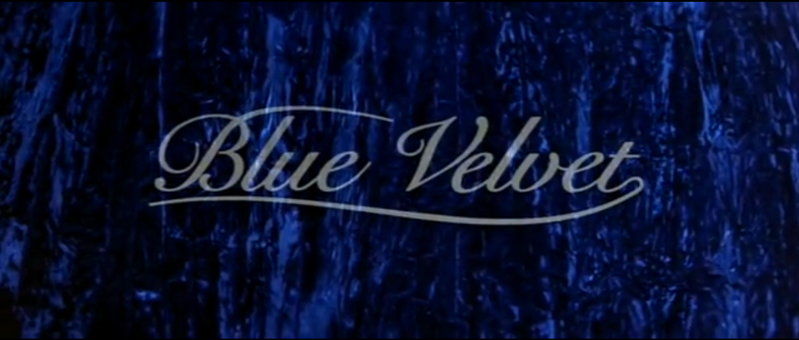 In the background is dark blue velvet, an obvious representation of the film's name. The fabric is swaying slowly as if it is caught in a light breeze. This slow movement matches the slow tempo of the music and helps to further create tension. It is also more visually engaging than a static background when seen on a cinema screen. The opening titles start at 0:15 and are as follows: