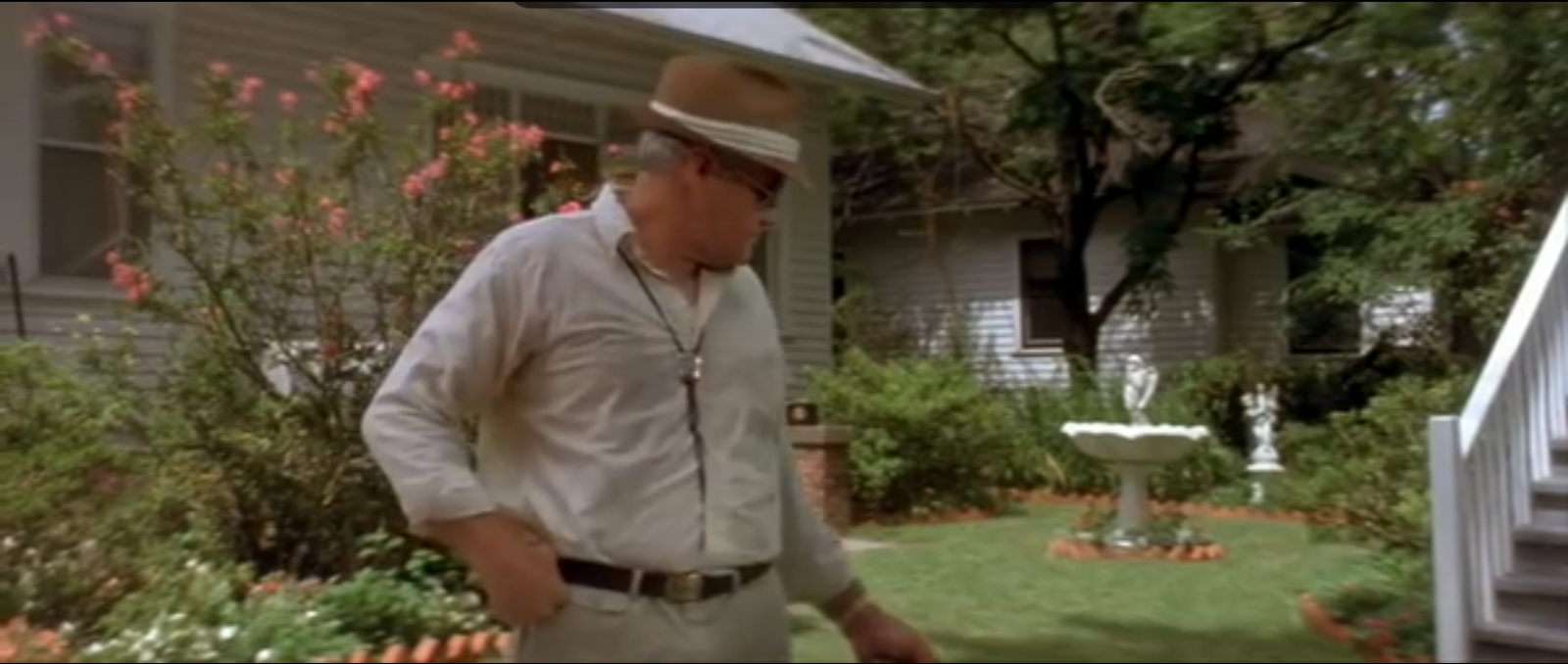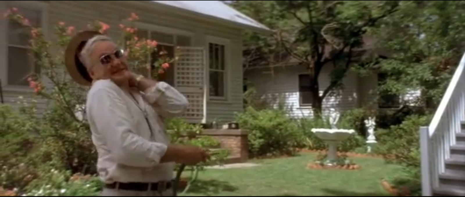Yet another dissolve at 2:11 is made to an off-centre long establishing shot of an American suburban house, previously seen behind the fire engine. A straight cut is made to a long shot of an elderly man watering his garden with a hose. The scene looks idyllic and calm, very much fitting in with the rest of the extract thus far.