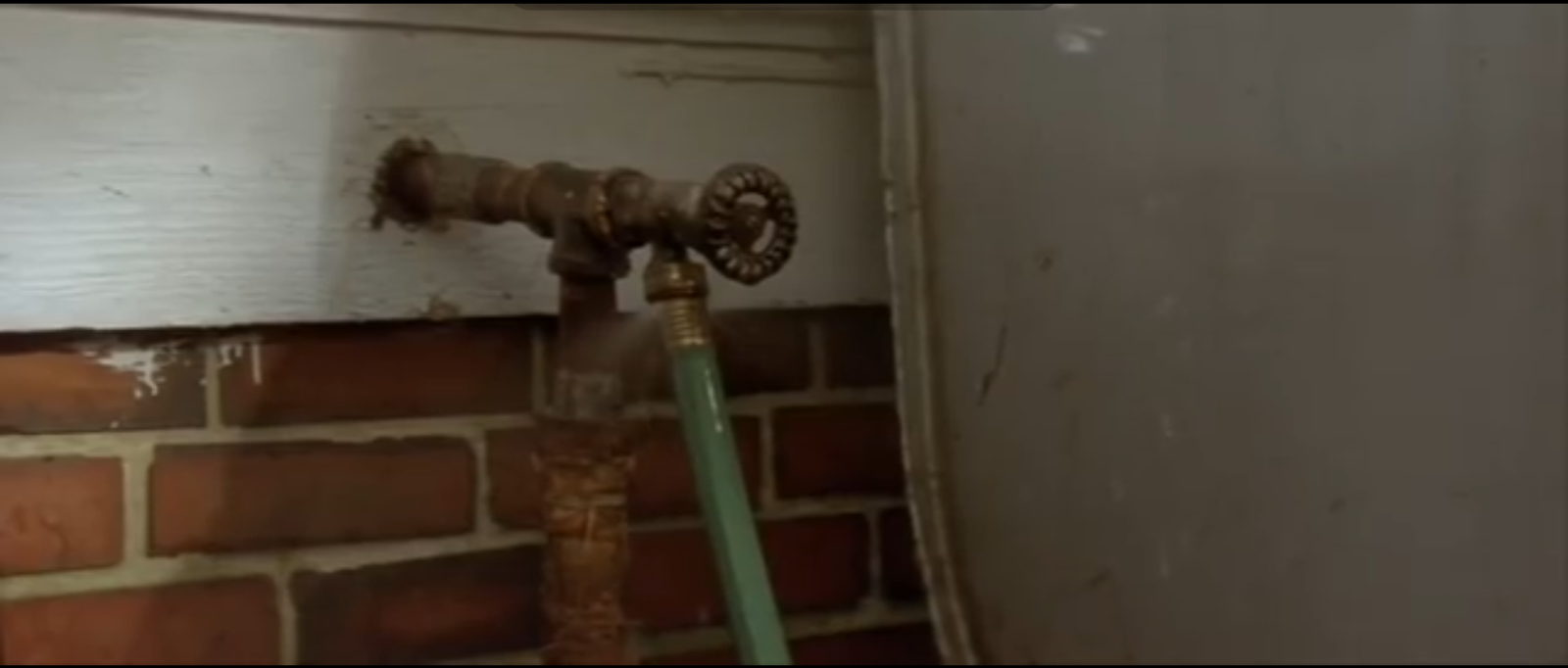 A close up of the hose attached to the tap follows. A closer close-up is also featured later in the sequence, drawing attention and building suspense. The diegetic sound becomes very apparent and increases in volume. The hose is not attached properly and high pressure water is escaping from the sides. This also foreshadows that something is not right. The sound of the pressure also adds to the tension, which is ever increasing in the sequence from now on.